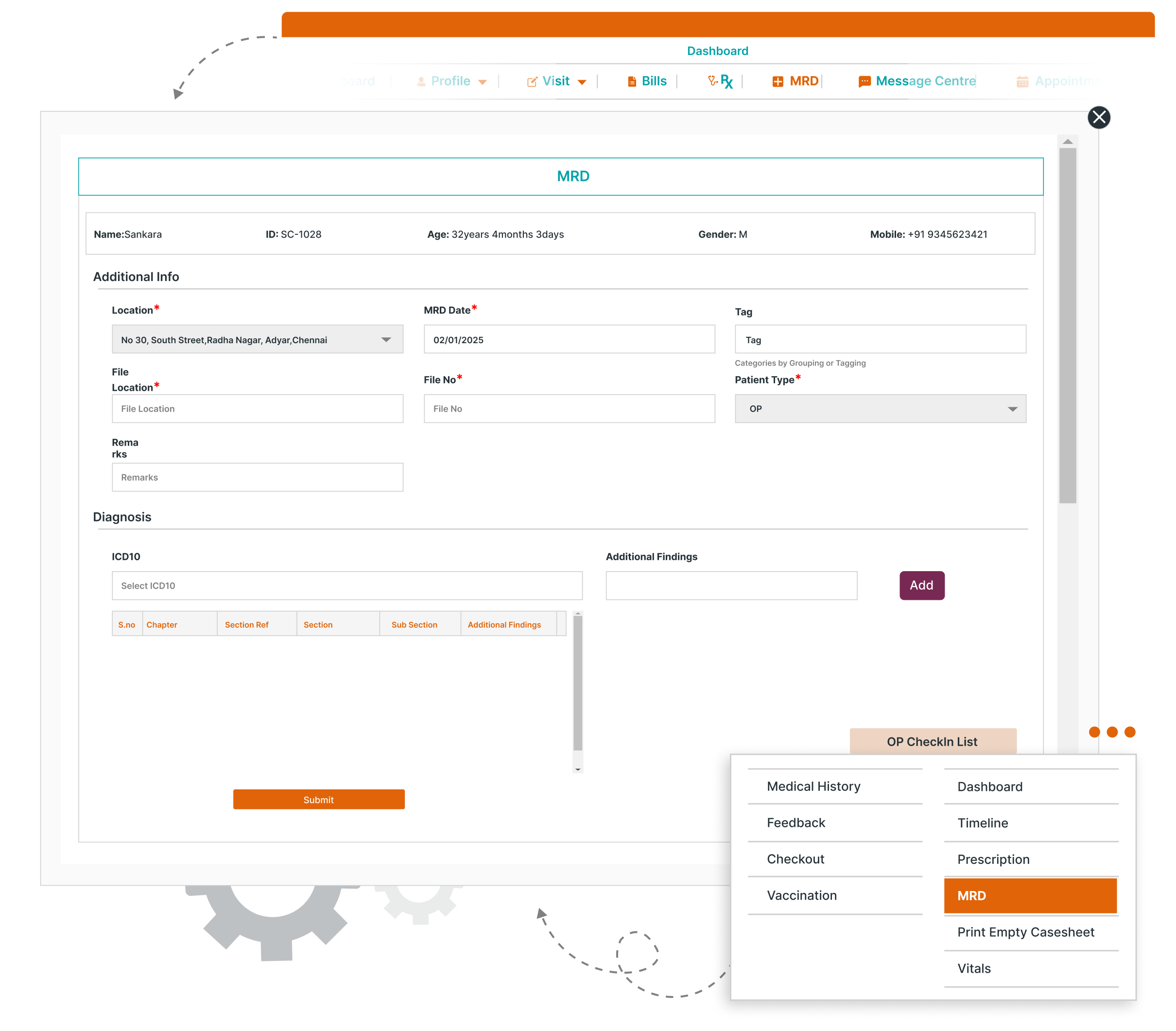 Record Retrieval: Doctors can quickly find and view medical records by navigating to the MRD section, displaying file numbers and other critical information.