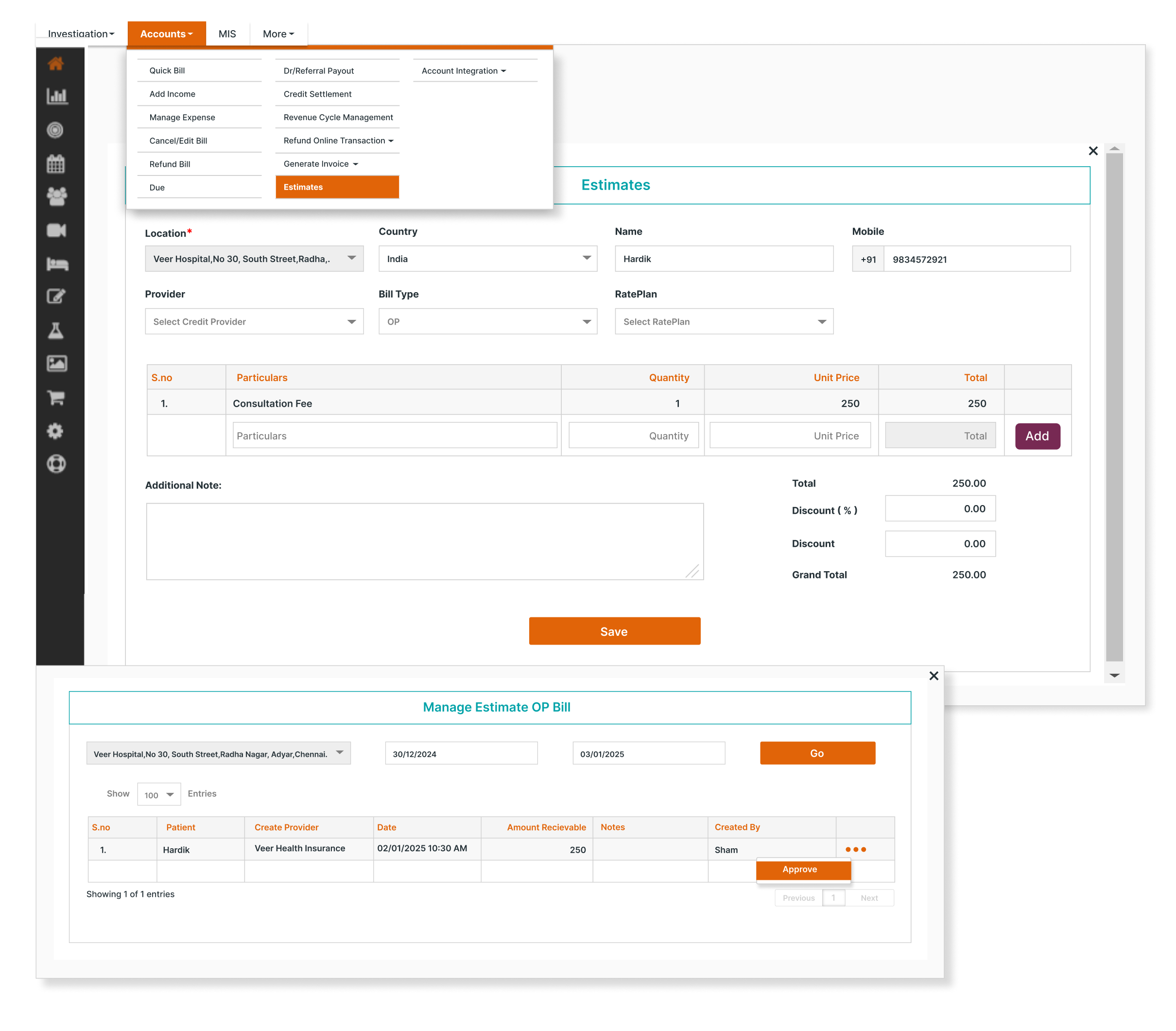 Seamless Conversion to Bills: When patients opt for services, the generated estimate can be instantly converted into a bill, eliminating duplicate entries and streamlining the billing process. This ensures operational efficiency and reduces administrative work.