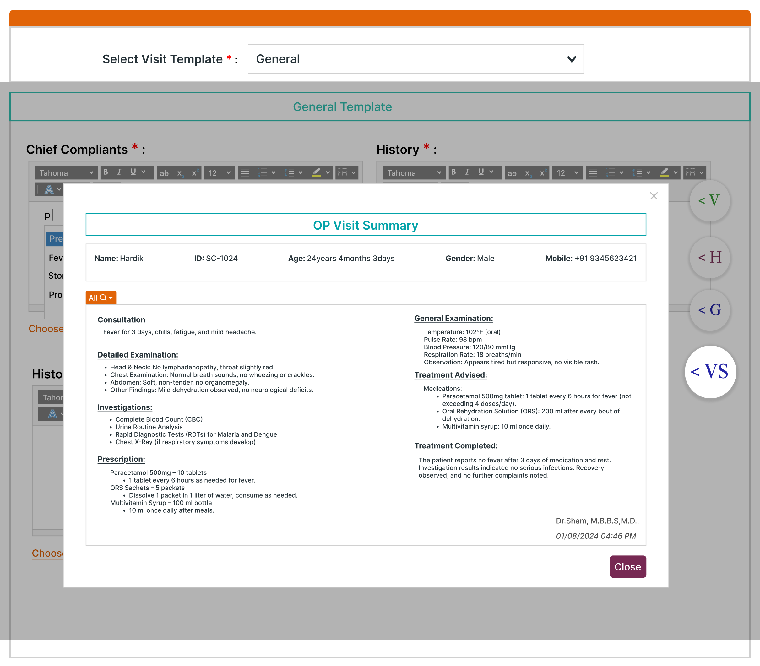 Make every consultation more insightful with the Visit Summary feature in our OP casesheet. With just a few clicks, doctors can access a clear and concise summary of a patient’s previous outpatient visits while managing the current one, eliminating the need to navigate through multiple systems or files.
