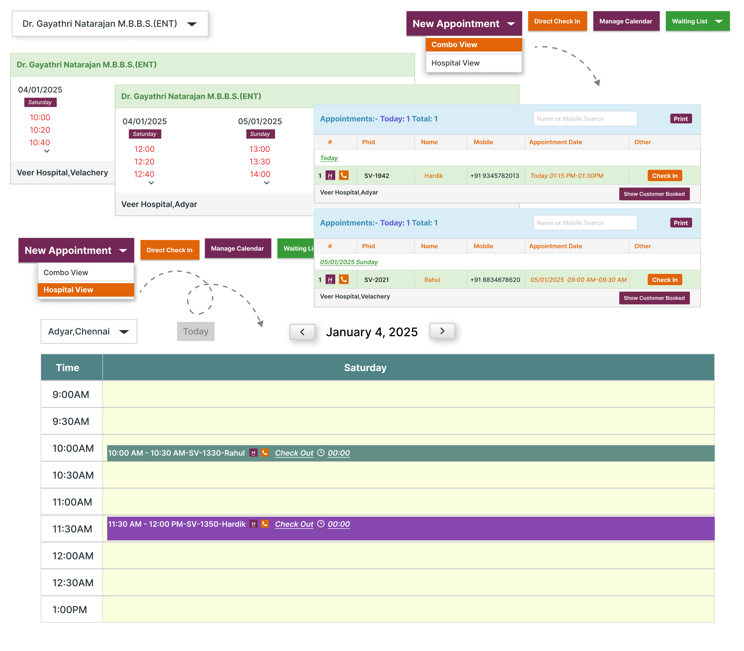 Comprehensive Appointment Views: MocDoc offers three views—Doctor View, Hospital View, and Combo View—to streamline scheduling and prevent conflicts. Doctor View focuses on a single doctor’s calendar, Hospital View gives a hospital-wide overview, and Combo View allows multi-location appointment booking for doctors, reducing errors.